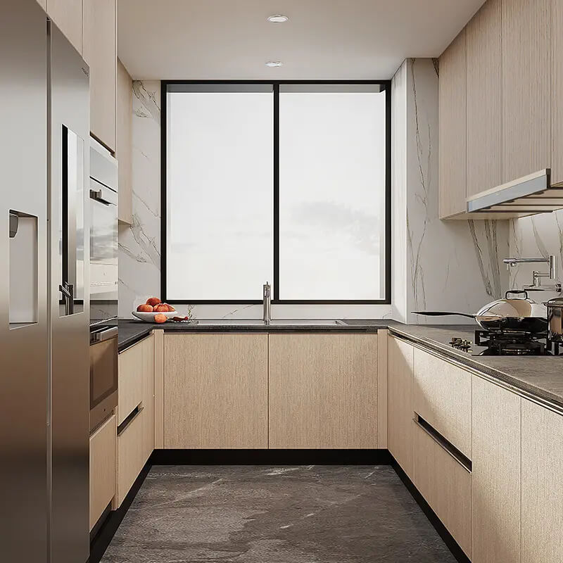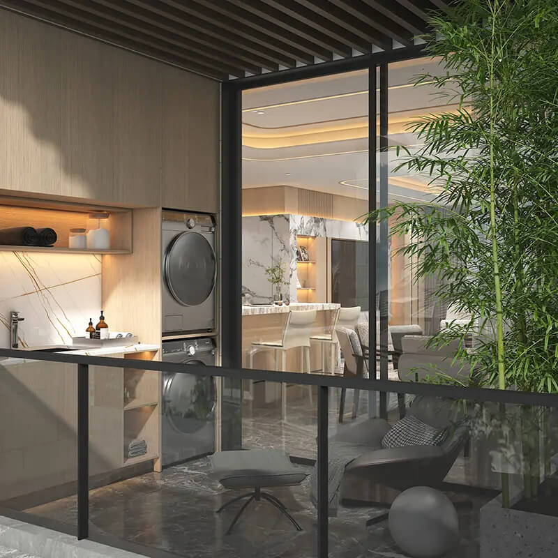 ‘MO’ is a fusion of oriental aesthetics and modern technology. The designers boldly use the collision technique by using native wood texture and matte lacquer finish, to create a sense of naturalness and strengthen the visual sense of the space. The kitchen intelligent system is integrated into the overall design: intelligent lifting island table, wine cabinet with intelligent controlled back panel, removable rail socket, dual electrical cabinet, etc., bringing a comfortable and convenient cooking experience.